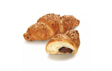 Deepfrozen Danish pastry, croissant filled (14,5%) with almond and hazelnut paste and decorated (2,5%) with chopped hazelnuts, ready-to-bake.